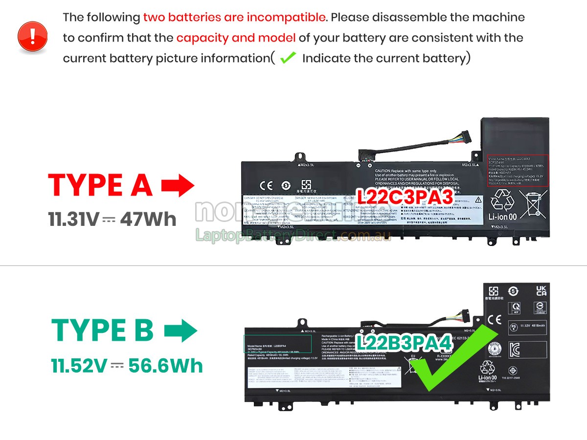 First, you need to find model name of your laptop or part number of the old battery(e.g. "IdeaPad SLIM 5 14ABR8-82XE006PMX"), and then check whether they