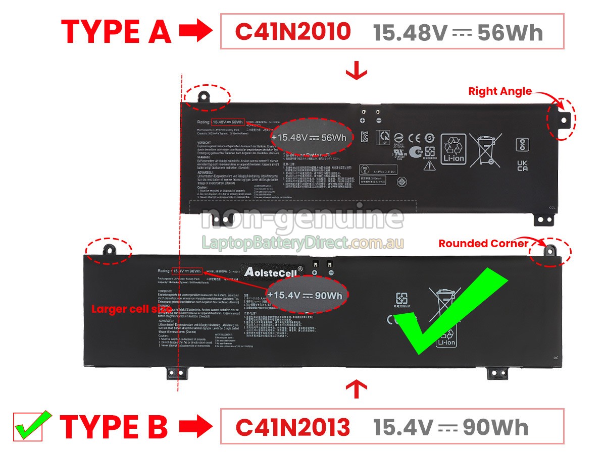 First, you need to find model name of your laptop or part number of the old battery(e.g. "TUF GAMING A15 FA507RC-HN021"), and then check whether they